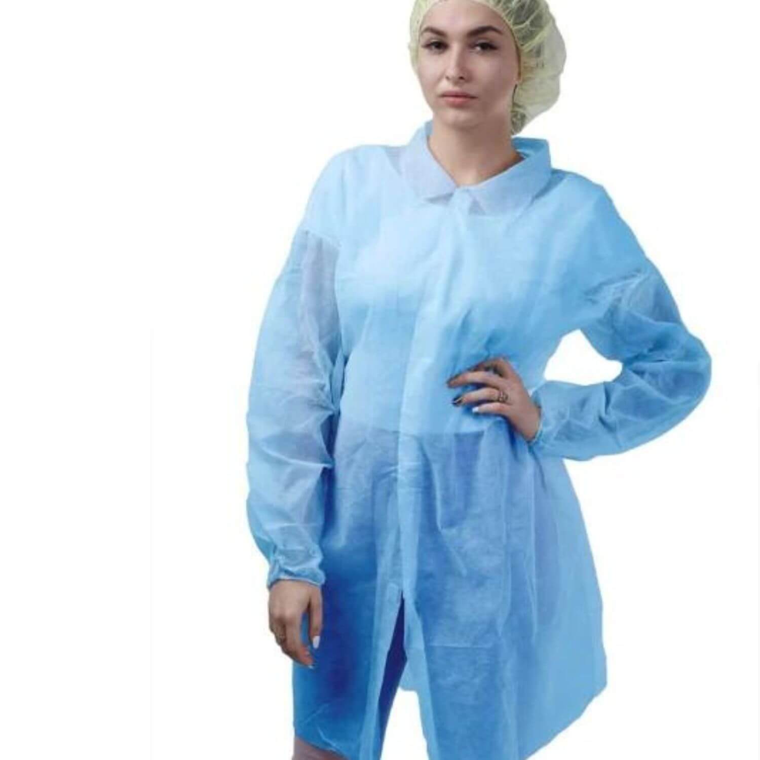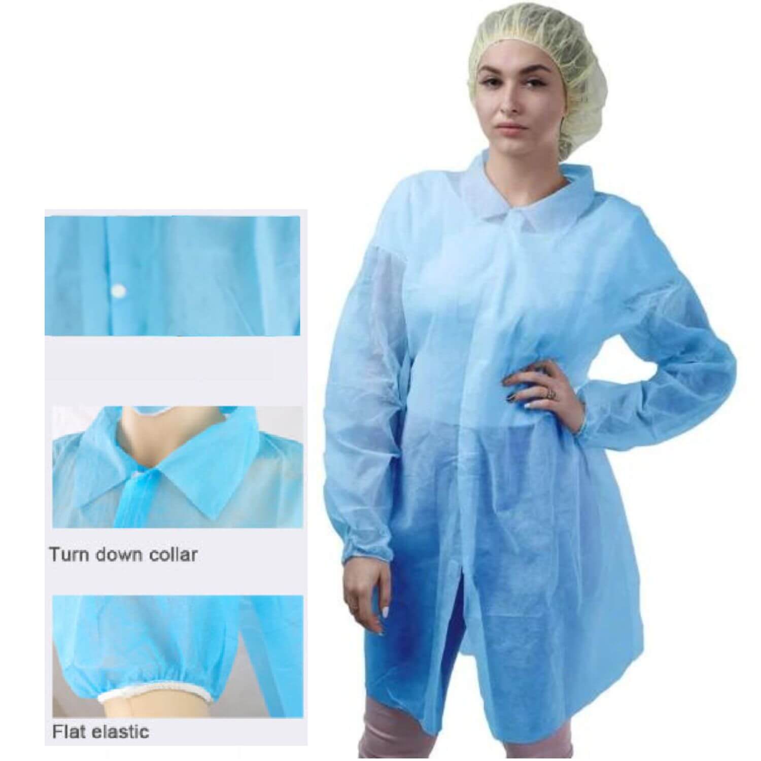 Camice monouso in un solo pezzo chiusura frontale con Bottoni a pressione con lacci elastico ai polsi.