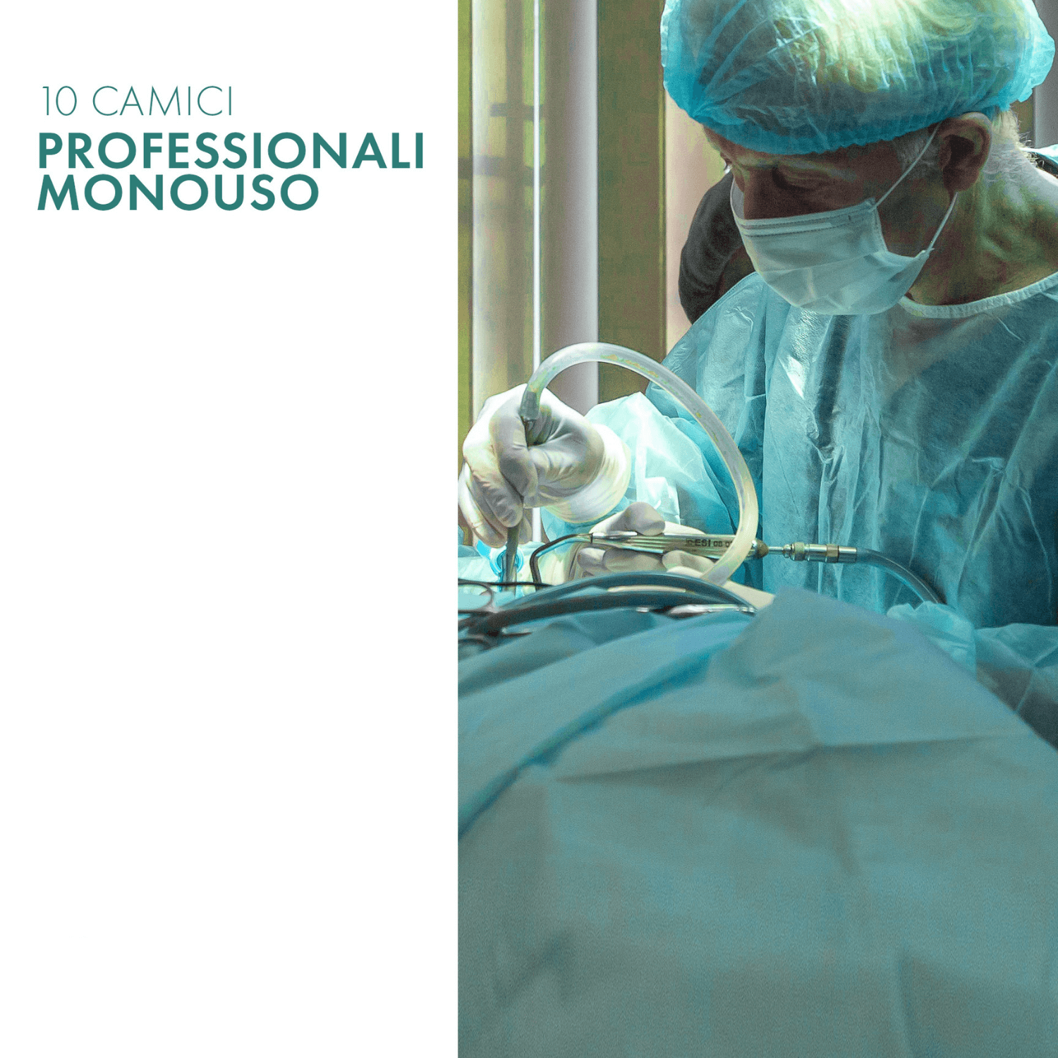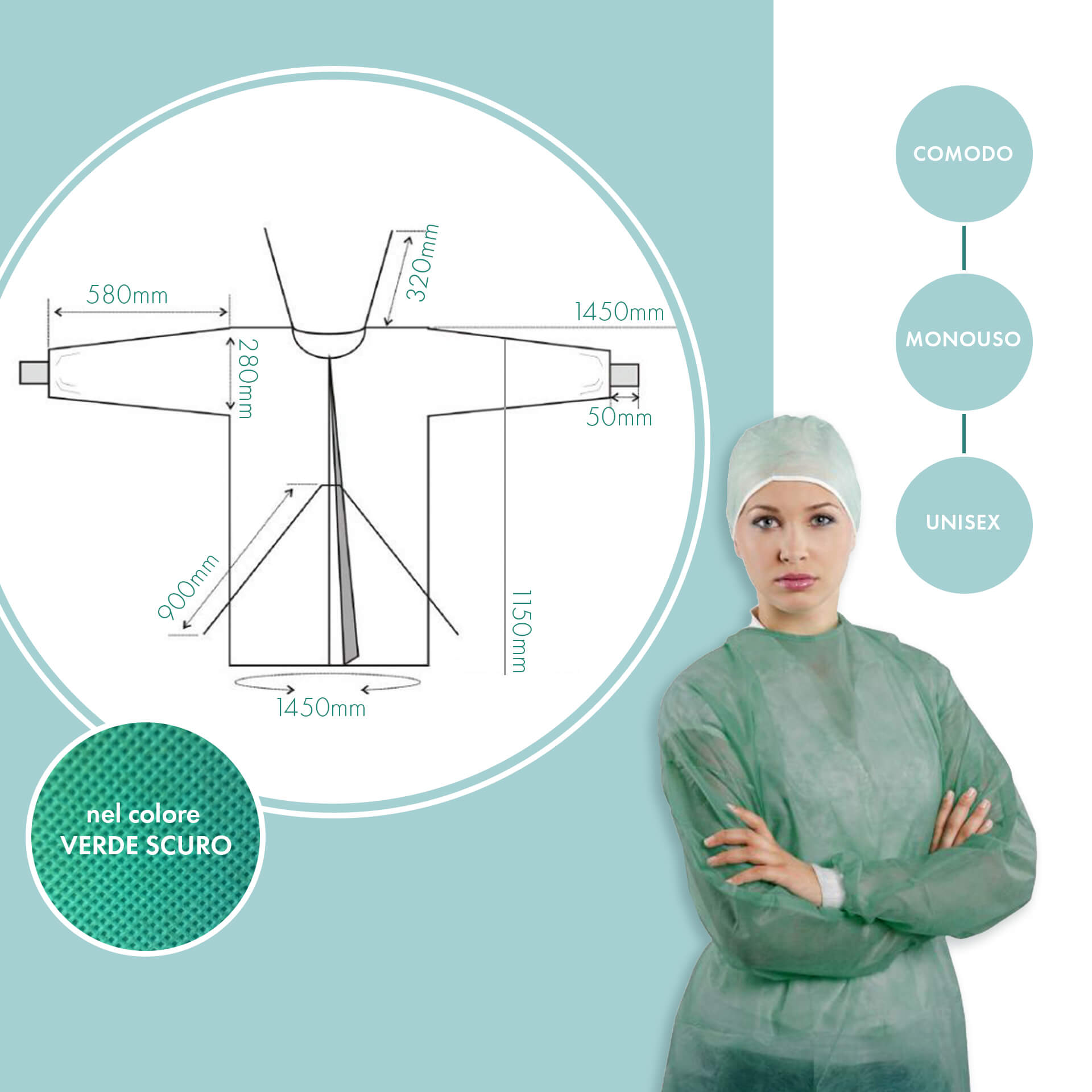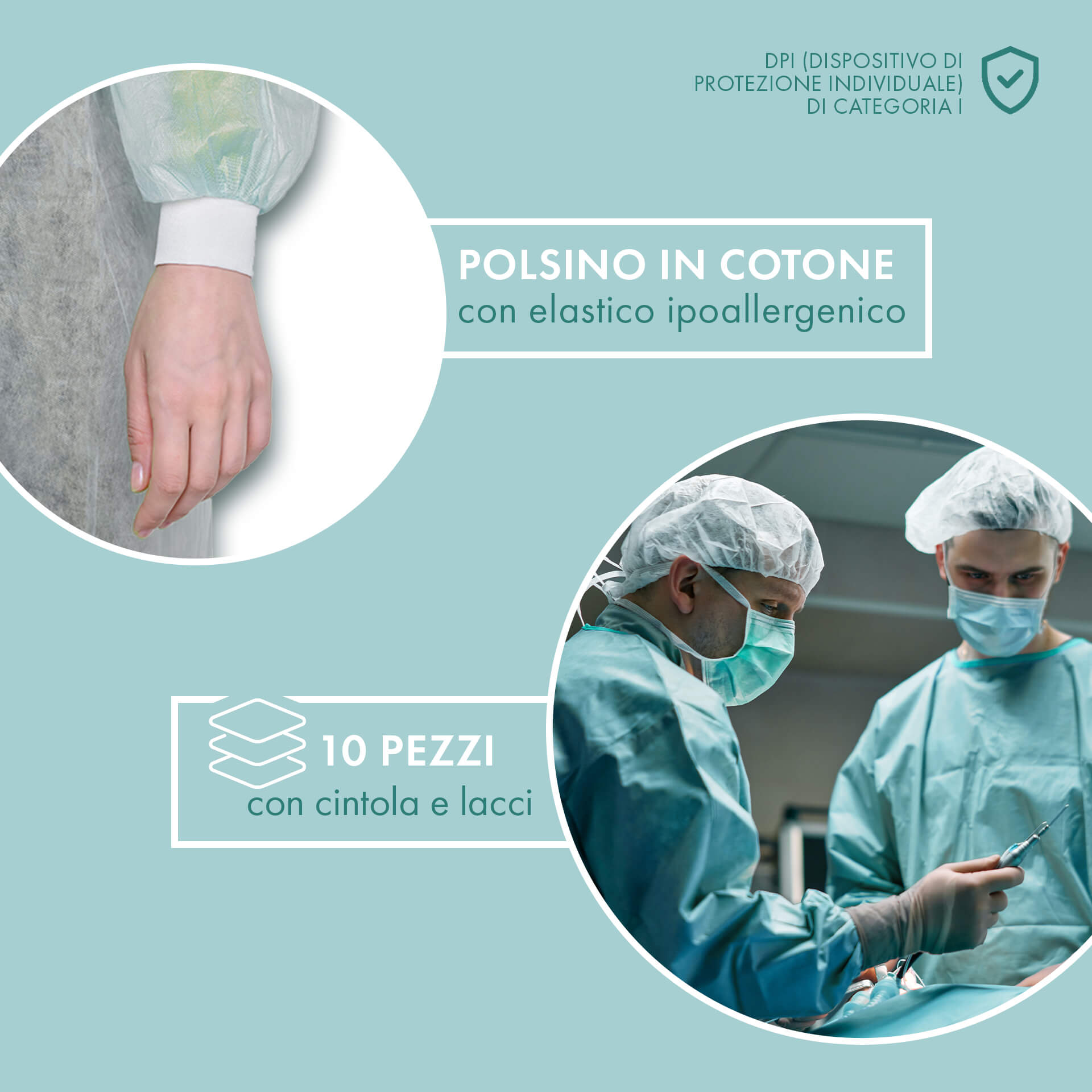 10 camici visitatore monouso in TNT di polipropilene (25 g), a manica lunga, con chiusura con cintola e lacci al collo e alla vita, elastico ipoallergenico ai polsi in filo di cotone, polsino di maglia.