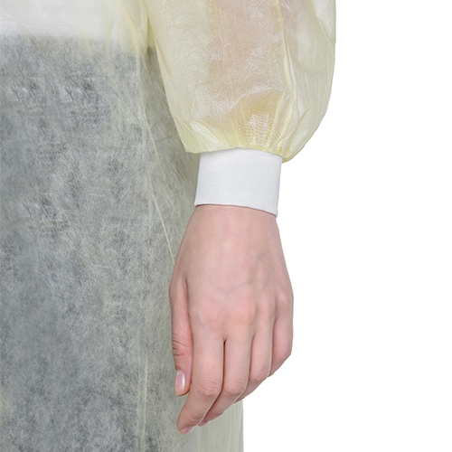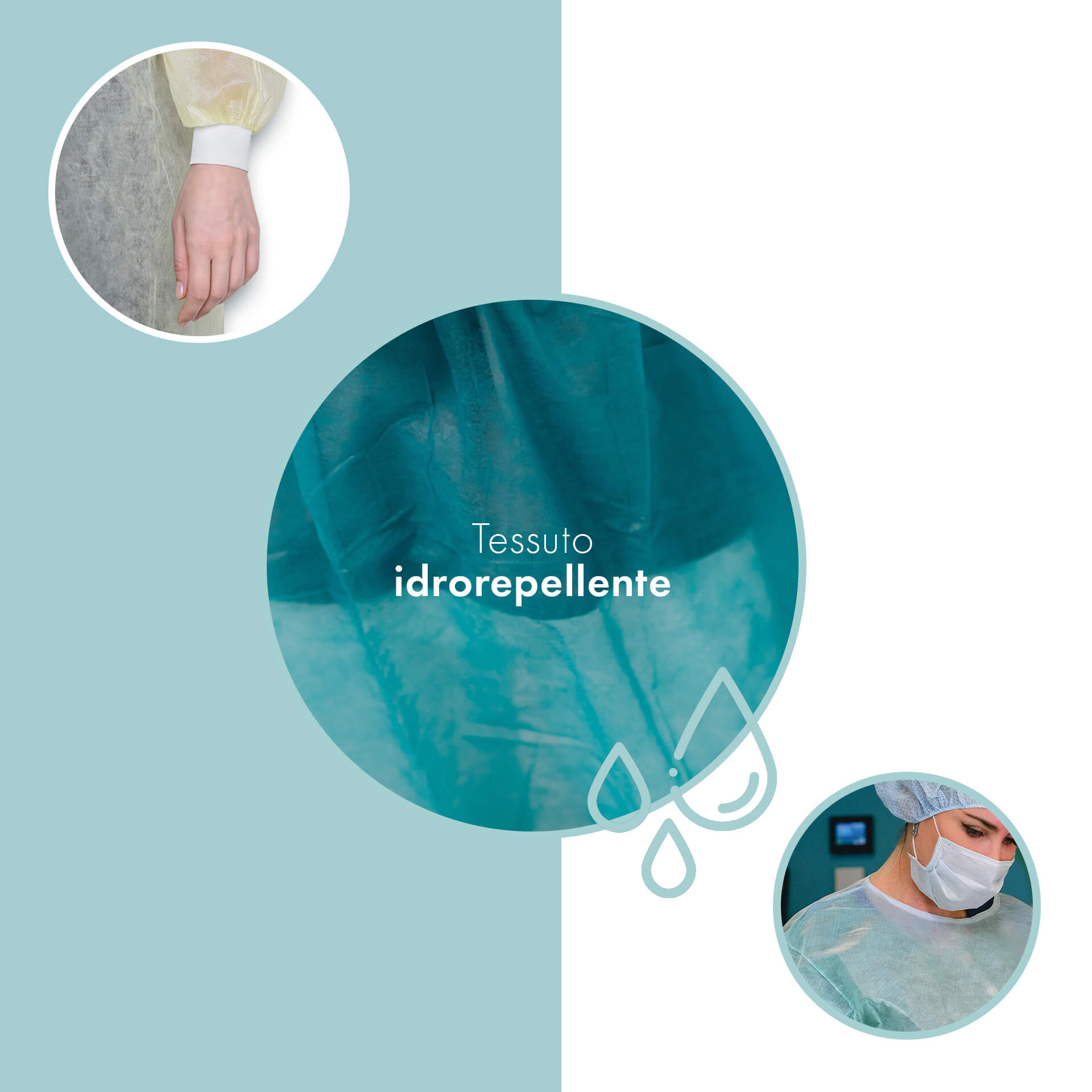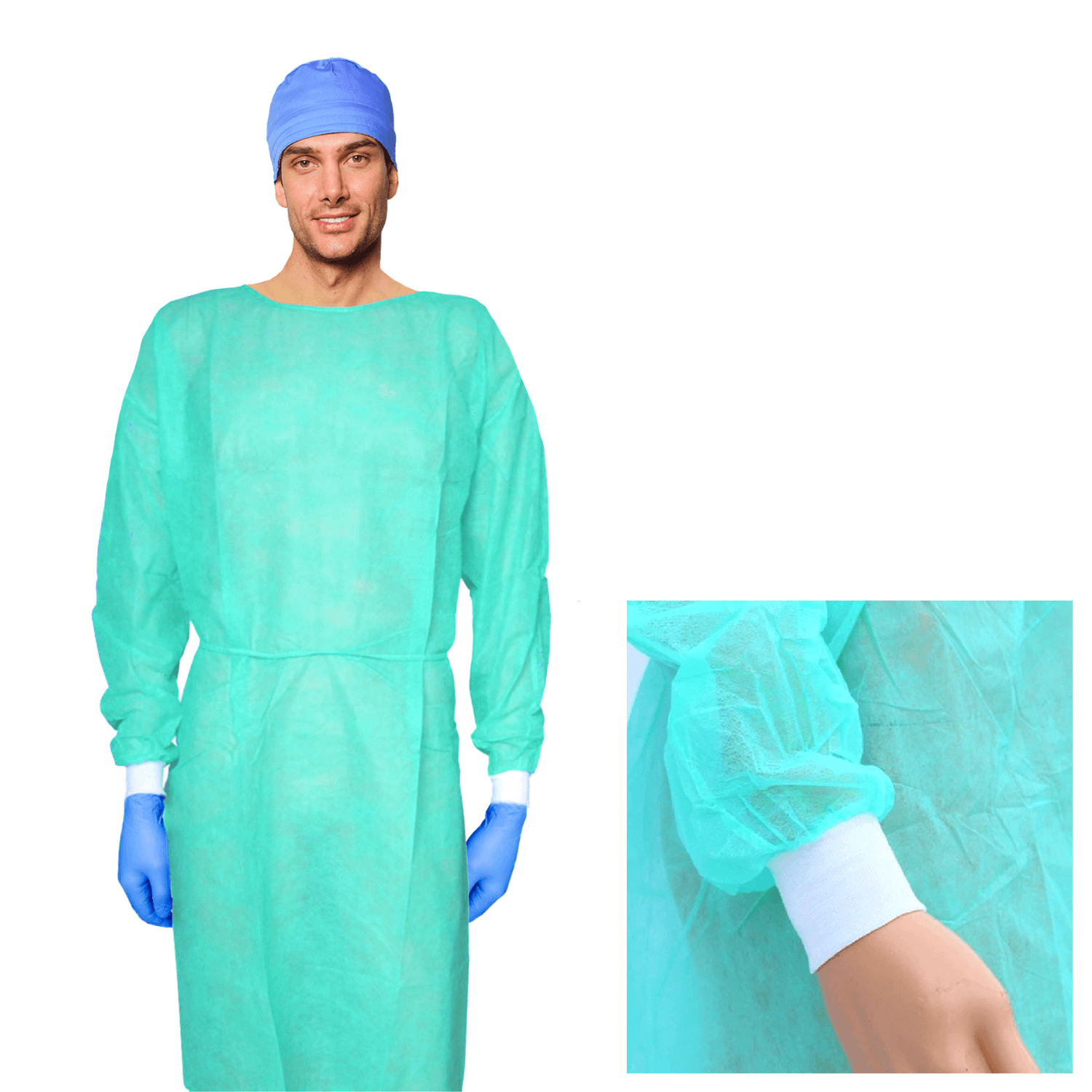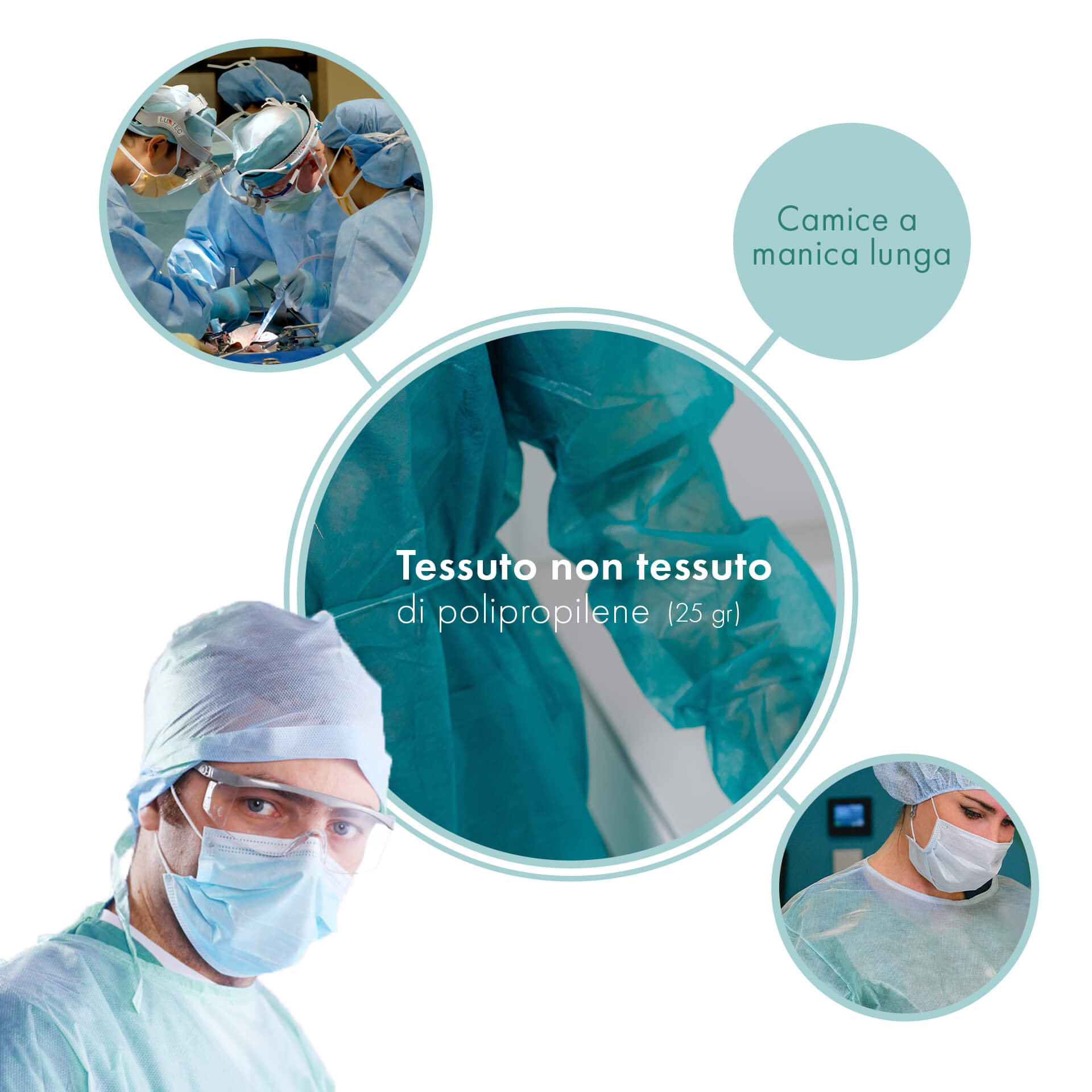 10 camici visitatore monouso in TNT di polipropilene (25 g), a manica lunga, con chiusura con cintola e lacci al collo e alla vita, elastico ipoallergenico ai polsi in filo di cotone, polsino di maglia.