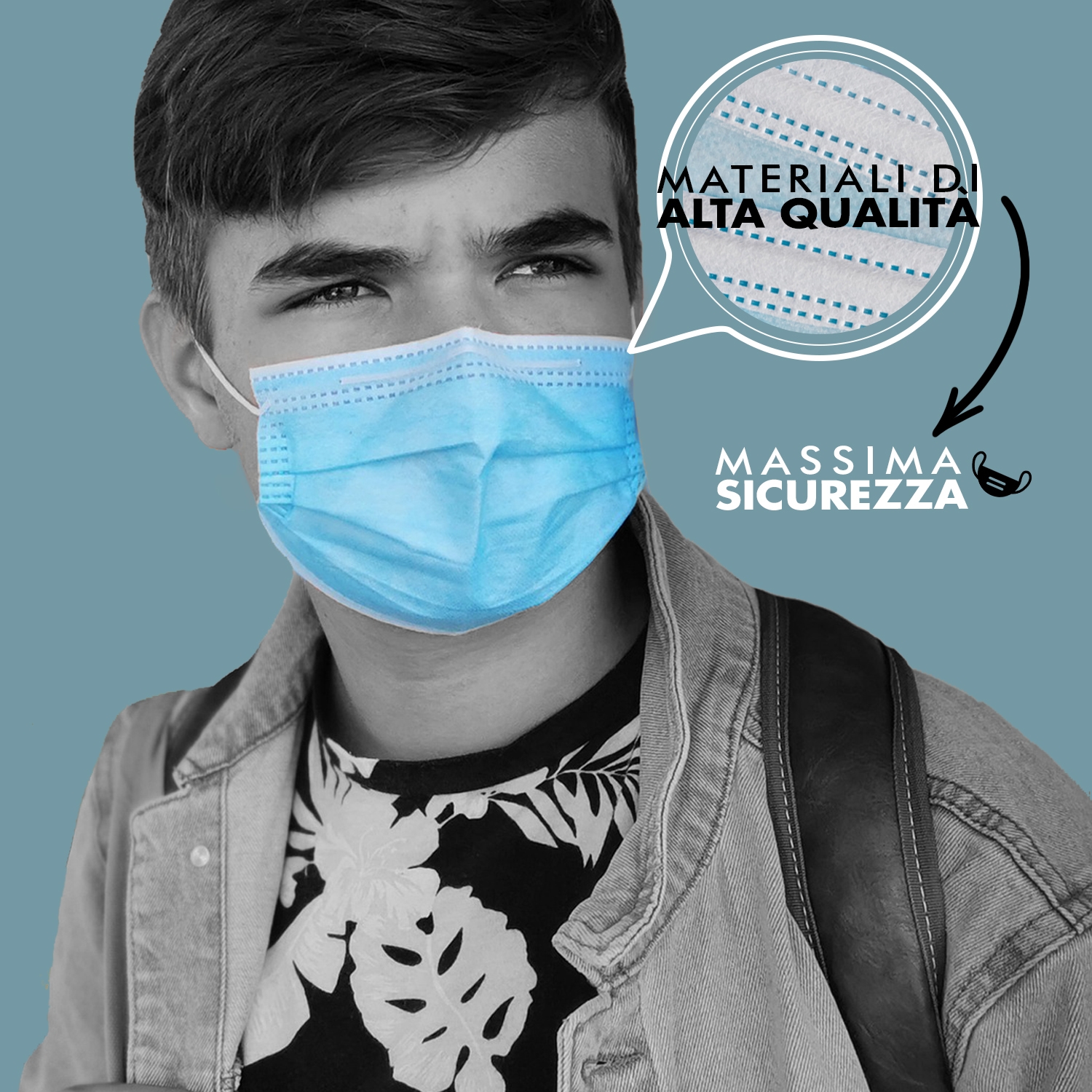Mascherina protettiva chirurgica monouso a tre veli, morbida, leggerissima e confortevole, adatta a pelli delicate.